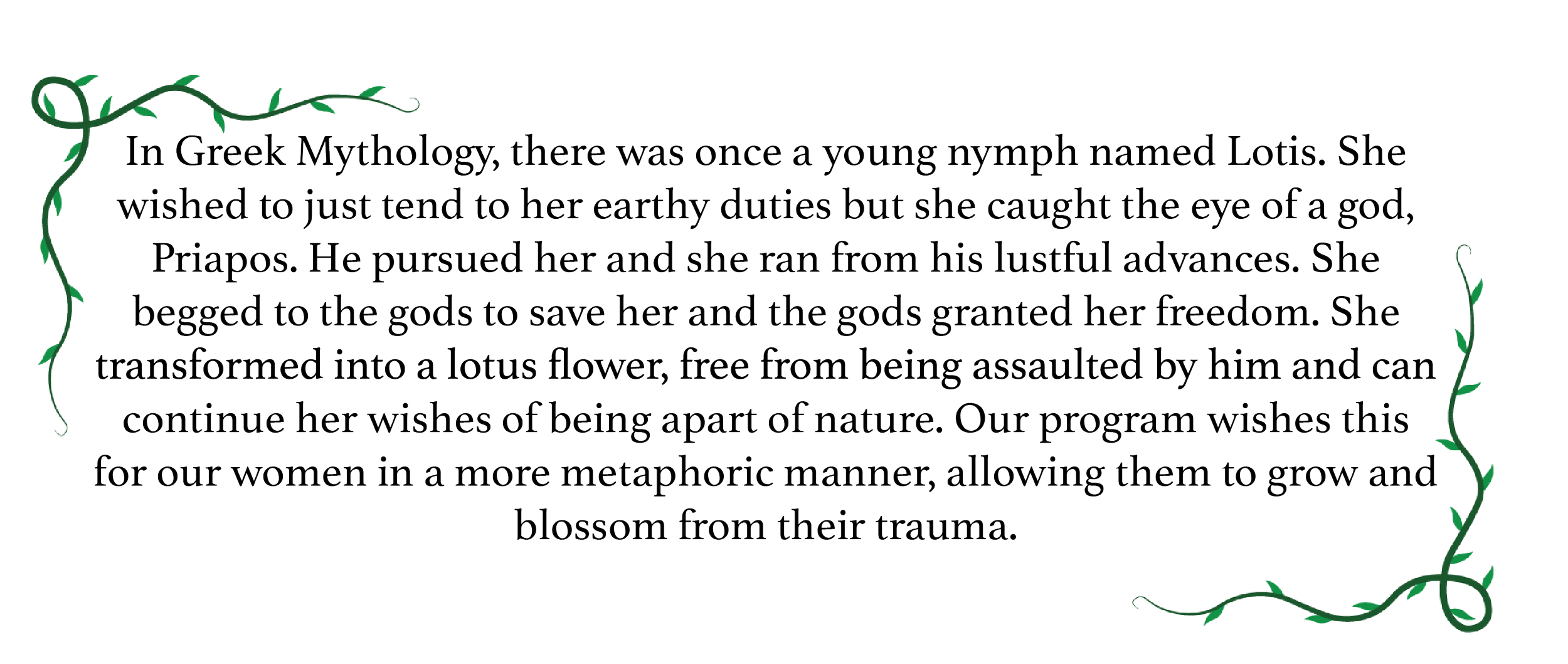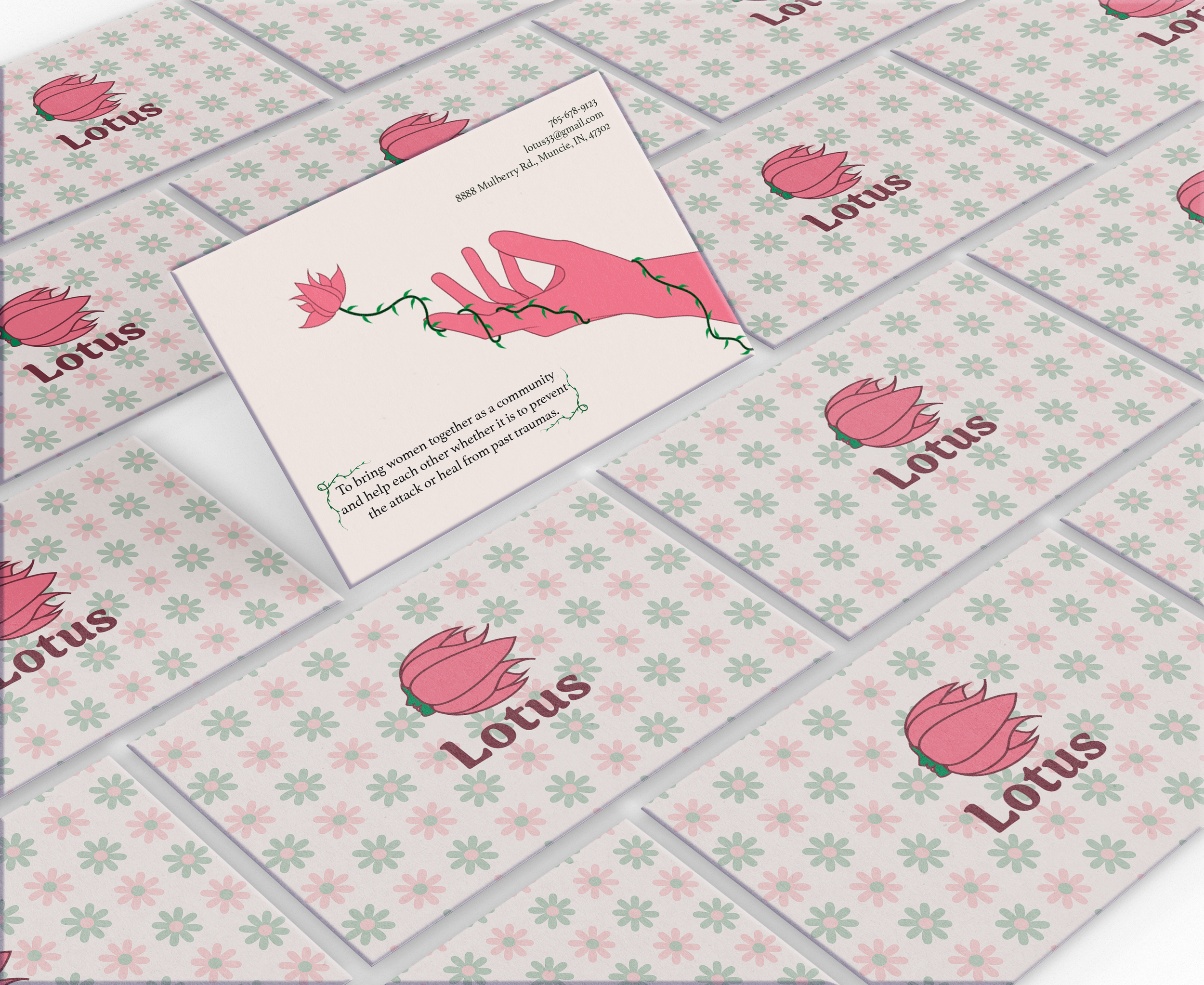 These are some of the stationery that Lotus provides to further push ourselves out into more communities. The bags are sent to newcomers in the mail to help welcome them into their new community. The cover letter is an essential element for representatives of the program to communicate to others in the community or people whom we wish to start working with. The business cards are left, along with the event programs, at random places at universities there for women to know who to contact if they want to join the community and start their healing process.
